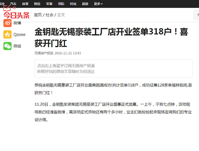 今日頭條報道金鑰匙子公司無錫金鑰匙豪裝工廠店盛大開業...